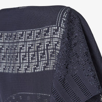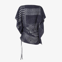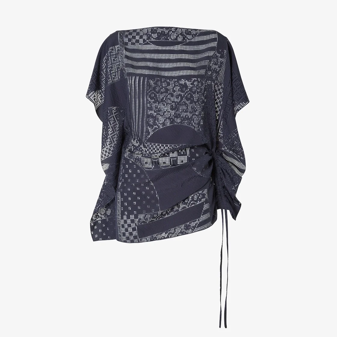 Loose-fitting asymmetrical top with boat neckline and short sleeves Featuring an asymmetric drawstring on the left hip. Made of blue viscose and silk with a burnout patchwork motif that depicts a combination of logos and archive patterns. Made in Italy Composition: 58% viscose, 42% silk Size worn: 38 IT. The model is 179 cm tall Product Code: FS8268AUJXF1RX5