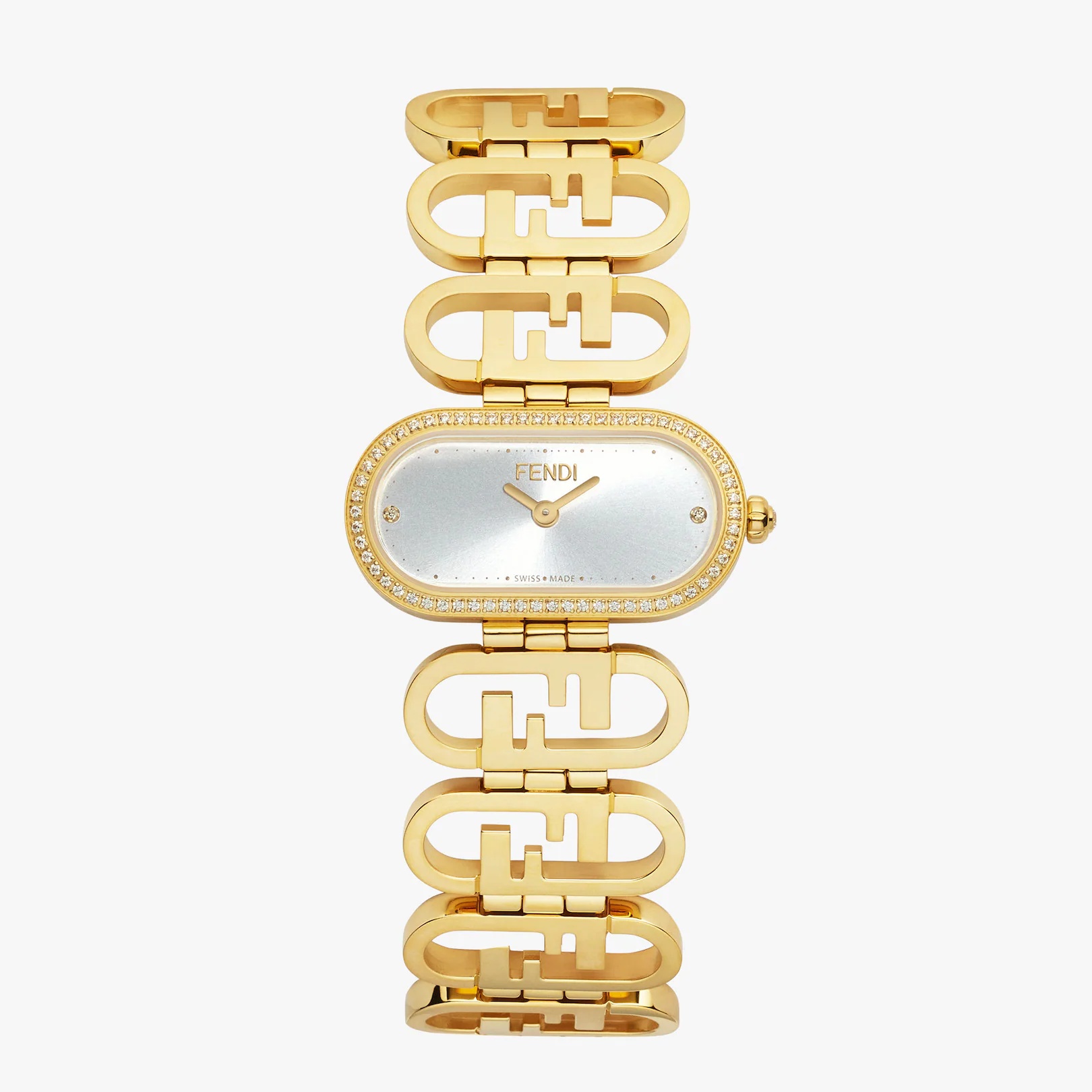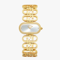 Shiny gold-colored stainless steel oval case, bezel with inset diamonds and crown with diamond. Silver-colored, sunray-effect face, indices with inset diamonds at 3 o’clock and 9 o’clock, gold-colored minute hands and gold-colored second hands with radius cut. Stainless steel bracelet with shiny gold-colored Fendi O’Lock shaped links and folding buckle. Composition: 100% stainless steel, 100% diamonds (65 stones ~0.18 carats) Model height: null Size worn: null Product Code: FOW959A2YOF0HH3 Instruction Manual: : :