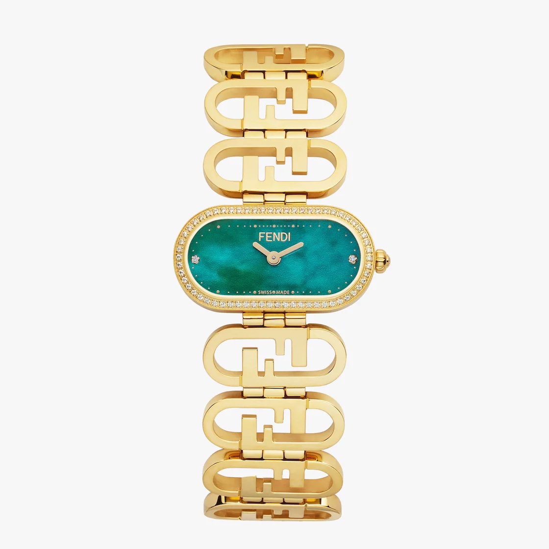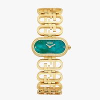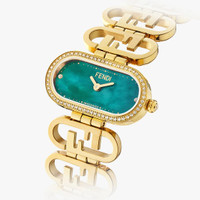 Oval case, 28.30 x 14.80 mm, in shiny gold-colored stainless steel, bezel with 62 diamonds, approximately 0.15 carats, and crown with 1 inset diamond, approximately 0.02 carats. Natural jade face in shades of green, indicators with inset diamonds at 3 o’clock and 9 o’clock, gold-colored minute and second hands with radius cut. Stainless steel bracelet with folding buckle, with shiny gold-colored Fendi O’Lock shaped links. Composition: : 100% Stainless Steel, 100% Diamonds (65 stones~0.18 cts) Model height: null Size worn: null Product Code: FOW966A2YOF011E Instruction Manual: : :
