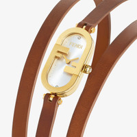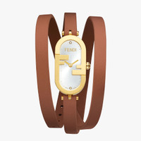 Shiny yellow-gold, satin-finish, 14.80 x 28.30 mm stainless steel oval case, with Fendi O’Lock bezel. Crown set with one diamond, around 0.02 carats. Silver-colored, sunray-effect dial, indicators with inset diamonds at 12 o’clock and 6 o’clock, totaling around 0.01 carats, gold-colored minute and second hands with radius cut. Caramel-colored leather band, 6.15 mm, with pin buckle. Composition: 100% stainless steel, 100% calf leather, 100% diamonds (3 stones ~0.03 carats) Product Code: FOW965AHP9F0MD7 Instruction Manual: