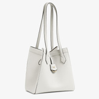 Medium Origami bag made of white full-grain leather. The style recalls the creativity and dual nature of Fendi with an innovative design that can be transformed. Thanks to eight concealed magnets the bag can be styled as a shopper bag or bucket bag by folding it origami style. It comes with a key case charm with the word Fendi in metal. Lined inner compartment and gold-finish metalware. It can be carried by hand or worn on the shoulder thanks to 2 leather handles. Made in Italy Measurements: - Height : 27 cm - Depth : 16.5 cm - Width : 27 cm - Weight : 0.5 kg Composition: 100% calfskin, inside: 60% polyamide, 40% polyurethane Product Code: 8BH414APZAF0K7E