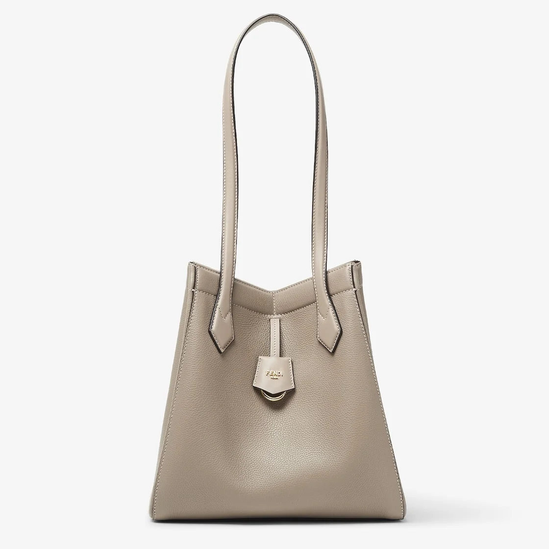 Medium Origami bag made of dove gray full-grain leather. The style recalls the creativity and dual nature of Fendi with an innovative design that can be transformed. Thanks to eight concealed magnets the bag can be styled as a shopper bag or bucket bag by folding it origami style. It comes with a key case charm with the word Fendi in metal. Lined inner compartment and gold-finish metalware. It can be carried by hand or worn on the shoulder thanks to 2 leather handles. Made in Italy Measurements: - Height : 27 cm - Depth : 16.5 cm - Width : 27 cm - Weight : 0.5 kg Composition: 100% calfskin, inside: 60% polyamide, 40% polyurethane Product Code: 8BH414APZAF11WS