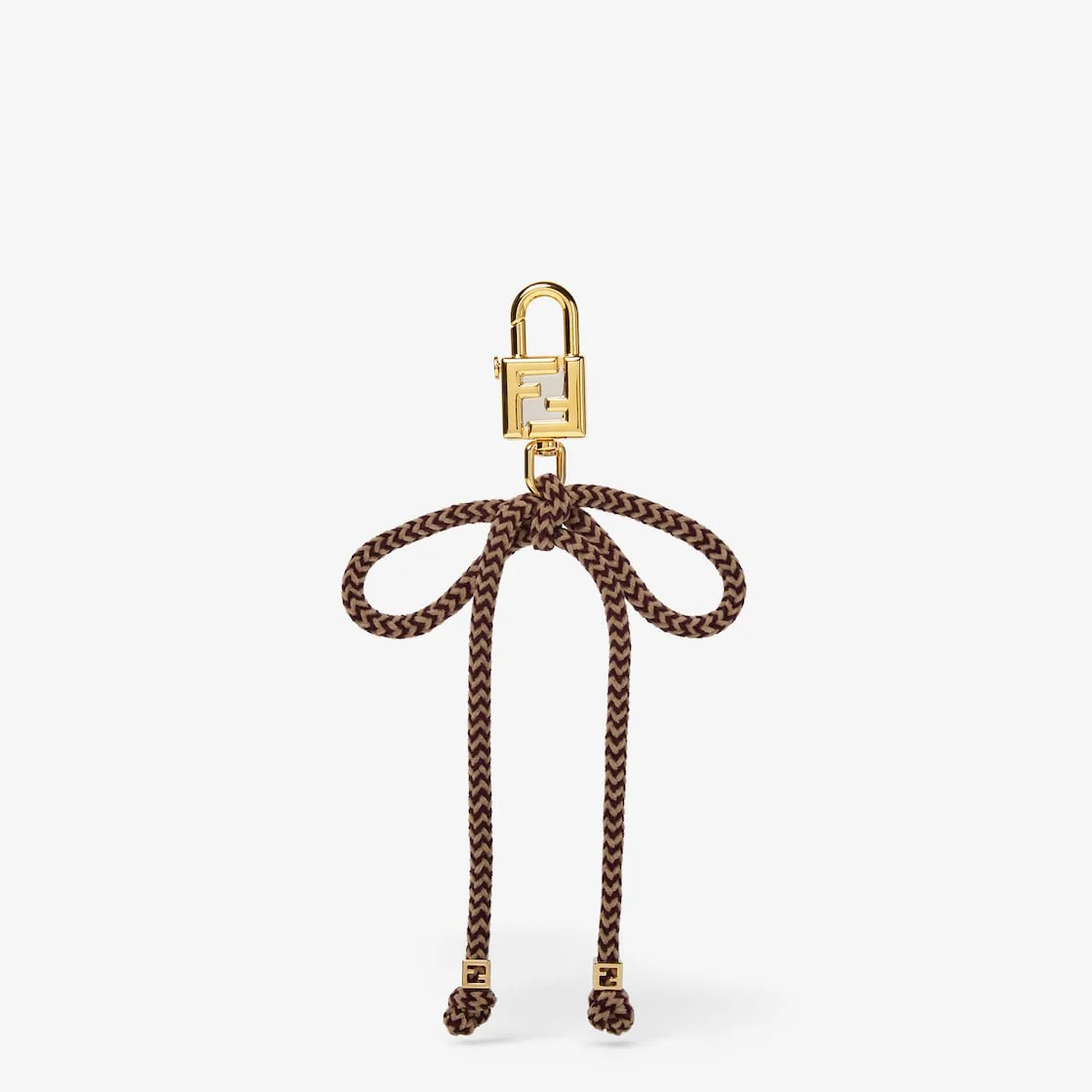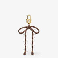 Charm with padlock-shaped clip and FF detail. Made of gold-finish metal. Long strap with bow motif in brown Chevron chenille. Embellished with two small geometric beads with FF logo. Perfect for customizing the look of all the collection bags. Made in Italy Composition: 100% brass Product Code: 7AS453NQ9F0F0N