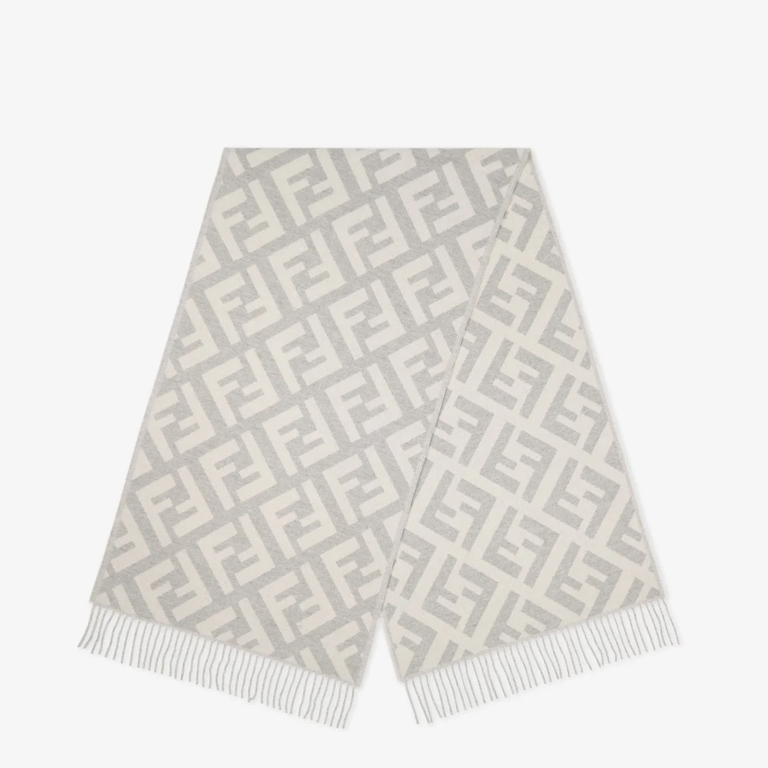 Long scarf finished with fringing. Made of pale gray wool and cashmere. The jacquard weave recreates the tone on tone FF motif. Made in Italy Length:45, cm Height:170, cm Composition: 100% Cashmere