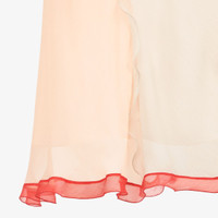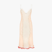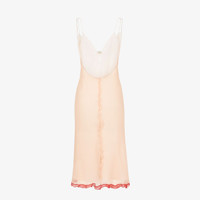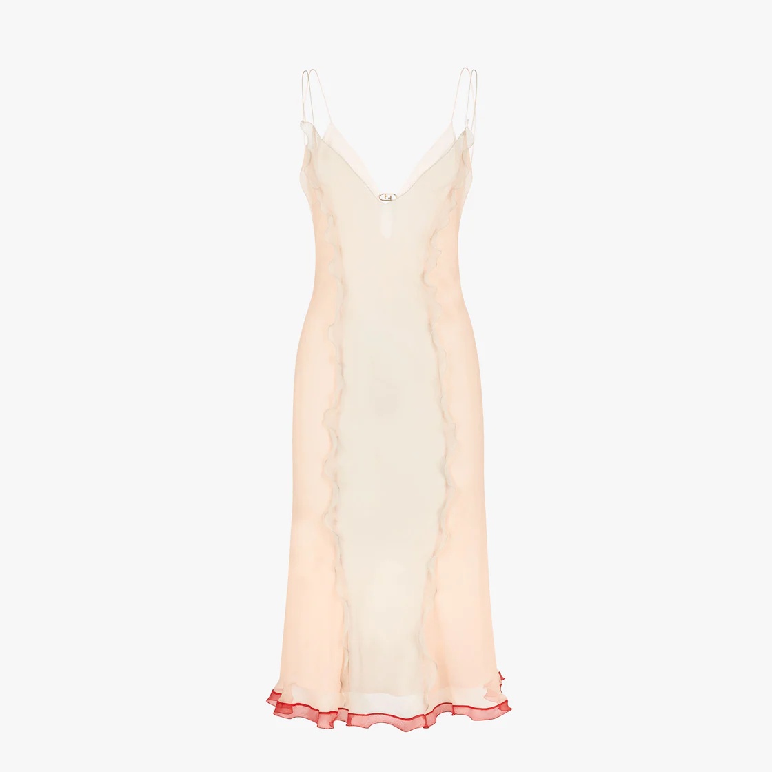 Midi slip dress with thin shoulder straps. Matching underdress. Made of light pink silk crepon chiffon with small matching-tone ruffles that accentuate the figure. Finished with red ruffles on the hem and Fendi O’Lock metal buckle with gold finish on the back. Made in Italy Composition: : 100% Silk, lining: 100% Viscose Model height: 176 cm Size worn: 38 IT Product Code: FDB884AKSPF1JAA