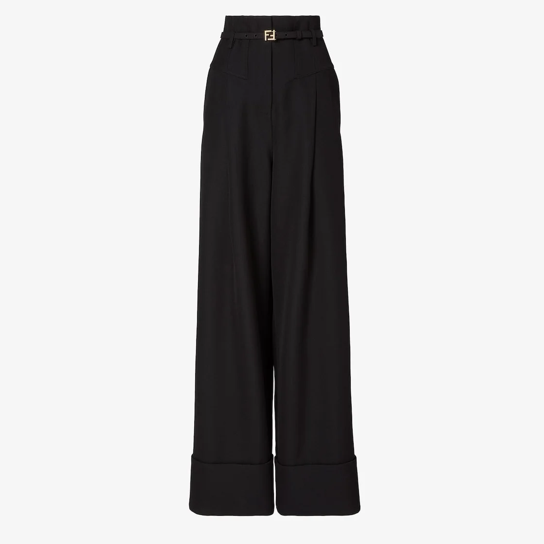 High-waisted pants with yoke detail and pleats on the front. Side pockets and wide, turned-up hem. Matching belt loops and belt with metal FF buckle at the waist. Concealed zipper fastening. Made of black grain de poudre wool. Palladium-finish metalware. Made in Italy Composition: 100% fleece wool Product Code: FR6673AJYFF0GME