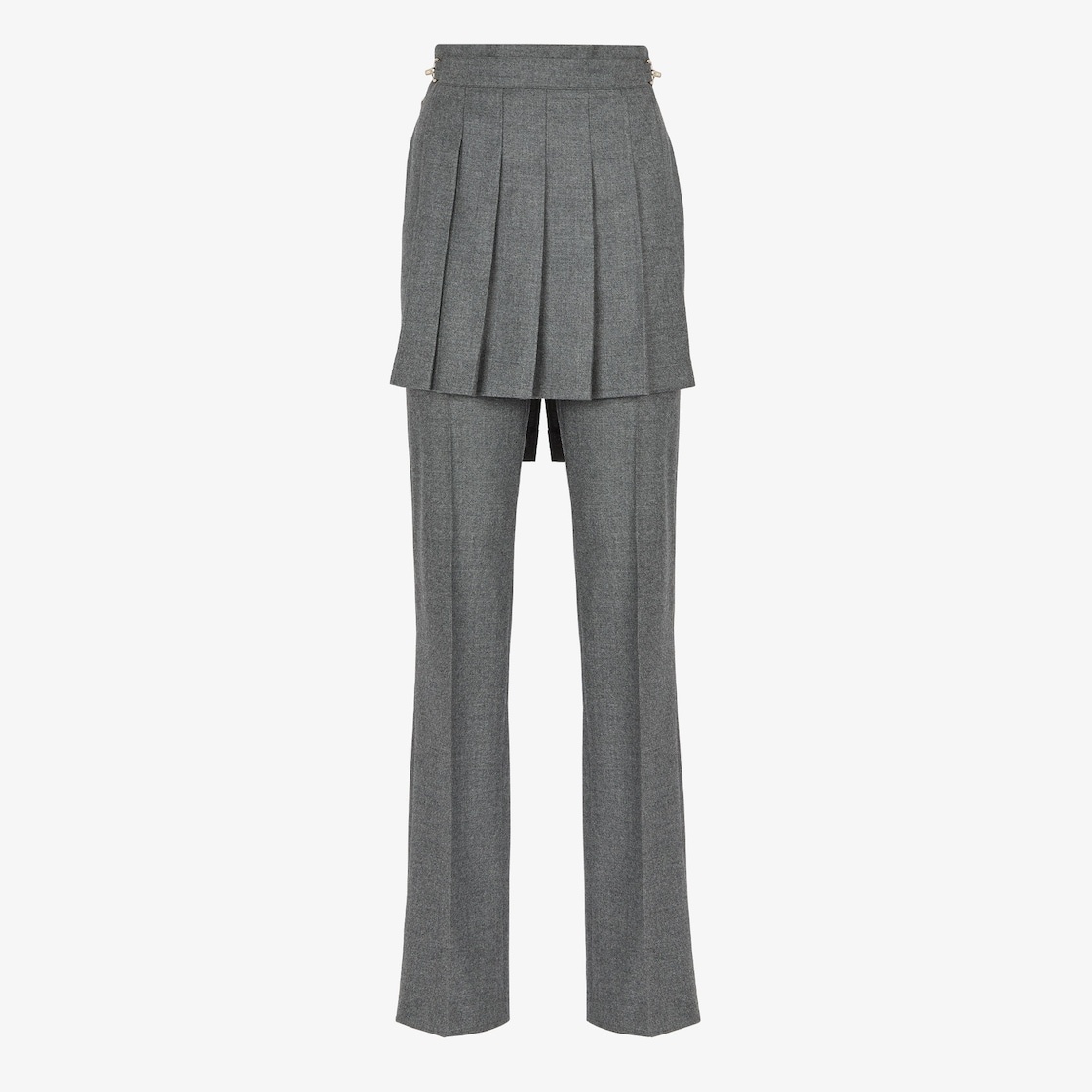 tailored skirt trousers Fendiâs AW23 collection sees tailoring reimagined with an avant-garde spin. From the lineup, these straight-leg trousers are tailored from wool and overlaid with a detachable pleated skirt. Highlights - Grey - Wool - High waist - Concealed front fastening - Detachable pleated skirt - Side pouch pockets - Straight leg Made in Italy Composition Wool 100% SIZE & FIT Model measurements Height 5 ft 10 in(1.78 m) Bust/Chest 32.67 in(83 cm) Hips 36.22 in(92 cm) Waist 24.4 in(62 cm) FittingInformation Designed for a slim fit, these trousers offer a close fit at the waist, allowing a comfortable close fit and some movement over the leg Made from a midweight non-stretch fabric This piece fits true to size – take your usual size