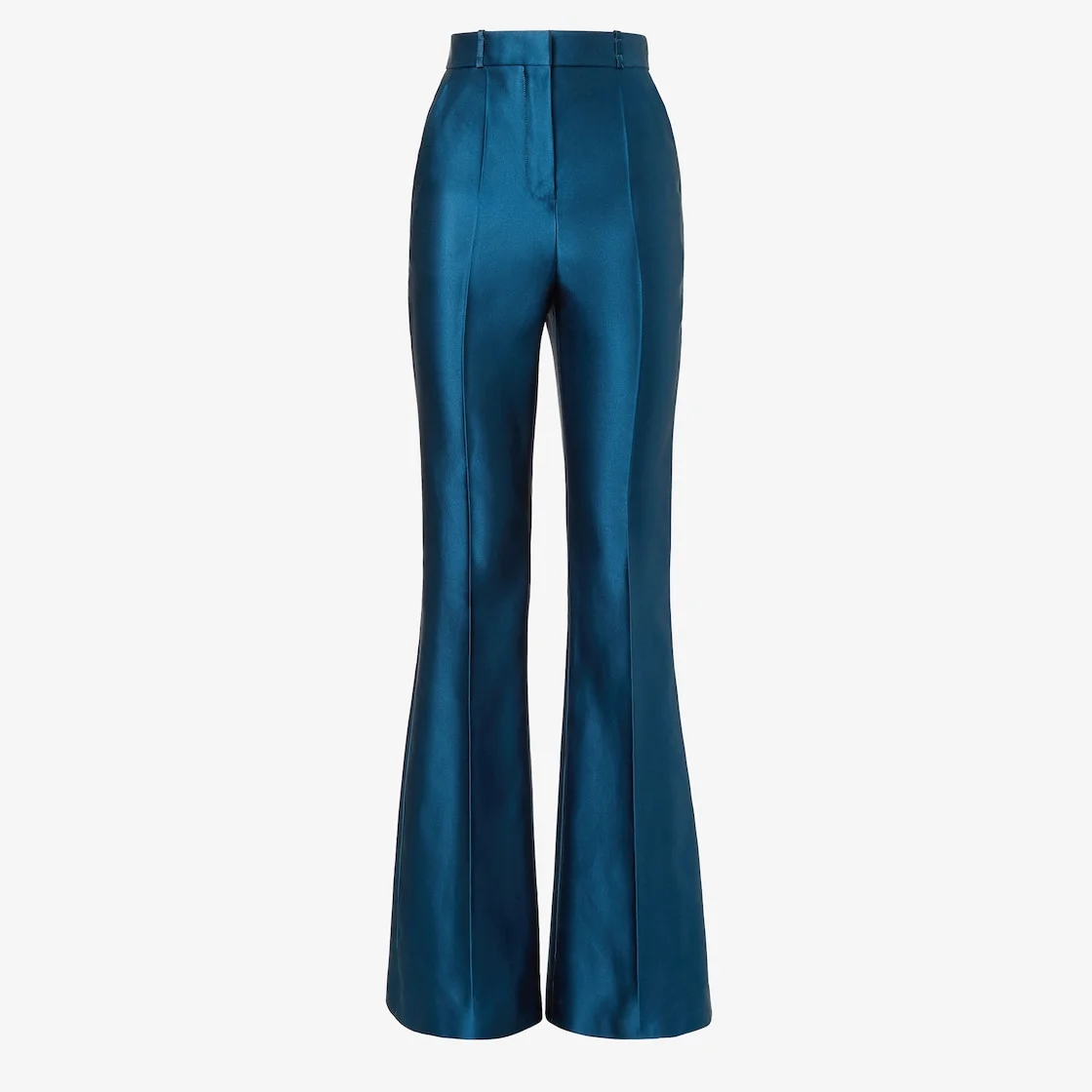 High-waisted Charleston pants, flared at the hem. Side pockets and stitched trouser crease. Concealed zipper closure. Made of teal blue silk duchesse satin. Made in Italy Composition: 100% silk Size worn: 38 IT. The model is 180 cm tall Product Code: FR6648A9DGF0RP6
