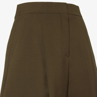 High-waisted riding pants with pleats at the front and cropped to above the ankle. Side pockets and front closure with covered zipper. Made of olive green wool and mohair. Made in Italy Composition: 75% wool, 25% mohair, fabric inner lining: 100% silk Product Code: FR6658AQ3HF1T6G