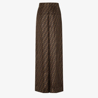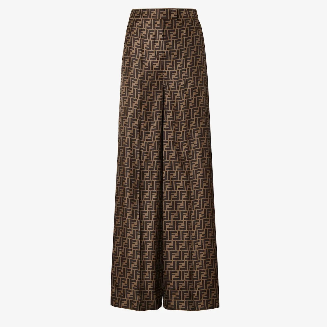 Wide leg pants with trouser crease. Side pockets and welt pockets on the back. Concealed zipper and hook closure. Made of silk twill with the iconic FF motif printed in brown. Made in Italy Composition: 100% silk Size worn: 38 IT. The model is 178 cm tall Product Code: FR6606A8G3F118W