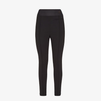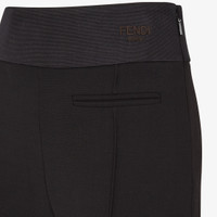 Slim-fit pants with gaiters at the hem and rib motif on the leg. Small welt pocket on the left side. Side zipper closure. Made of black wool cady. Embellished with wide, black satin band at the waist and contrasting Fendi Roma logo embroidery. Made in Italy Composition: 96% fleece wool, 4% elastane, 3 buttons: mother of pearl Fit: Slim Size worn: 38 IT. The model is 179 cm tall Product Code: FR6609ATNEF0GME