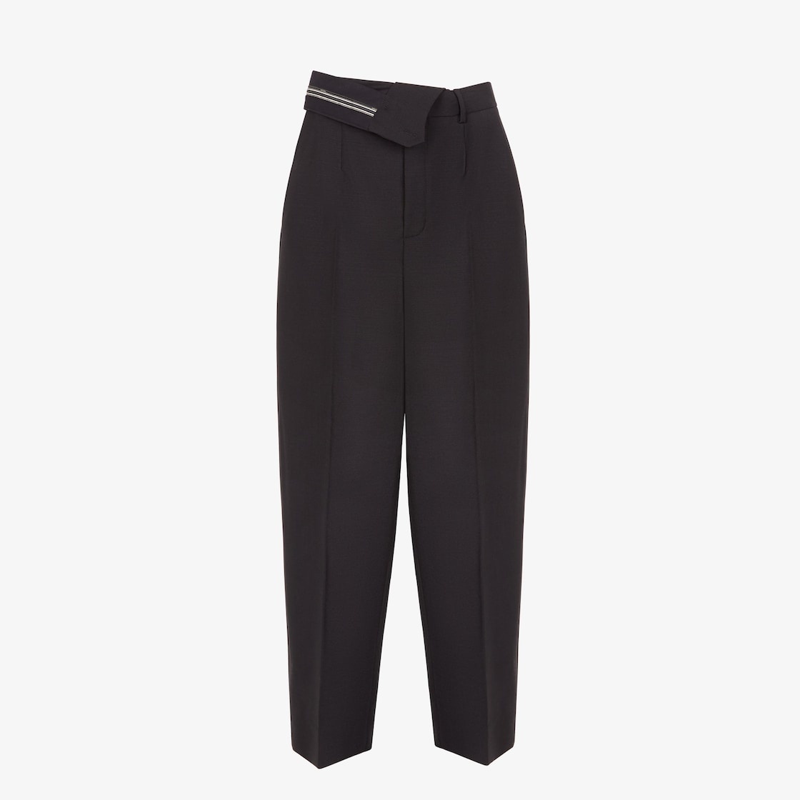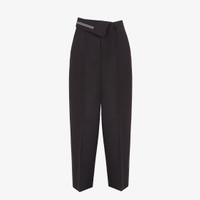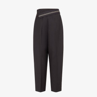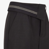 Carrot-fit pants with an asymmetric waist. Trouser crease, belt loops and side pockets. Concealed zipper and hook closure. Made of black kid mohair. Tailored construction with inside-out detail at the waist with Fendi Roma logo ribbon. Made in Italy Composition: 60% mohair, 40% wool, fabric inner lining: 100% silk Size worn: 38 IT. The model is 180 cm tall Product Code: FR6540S9AF0GME