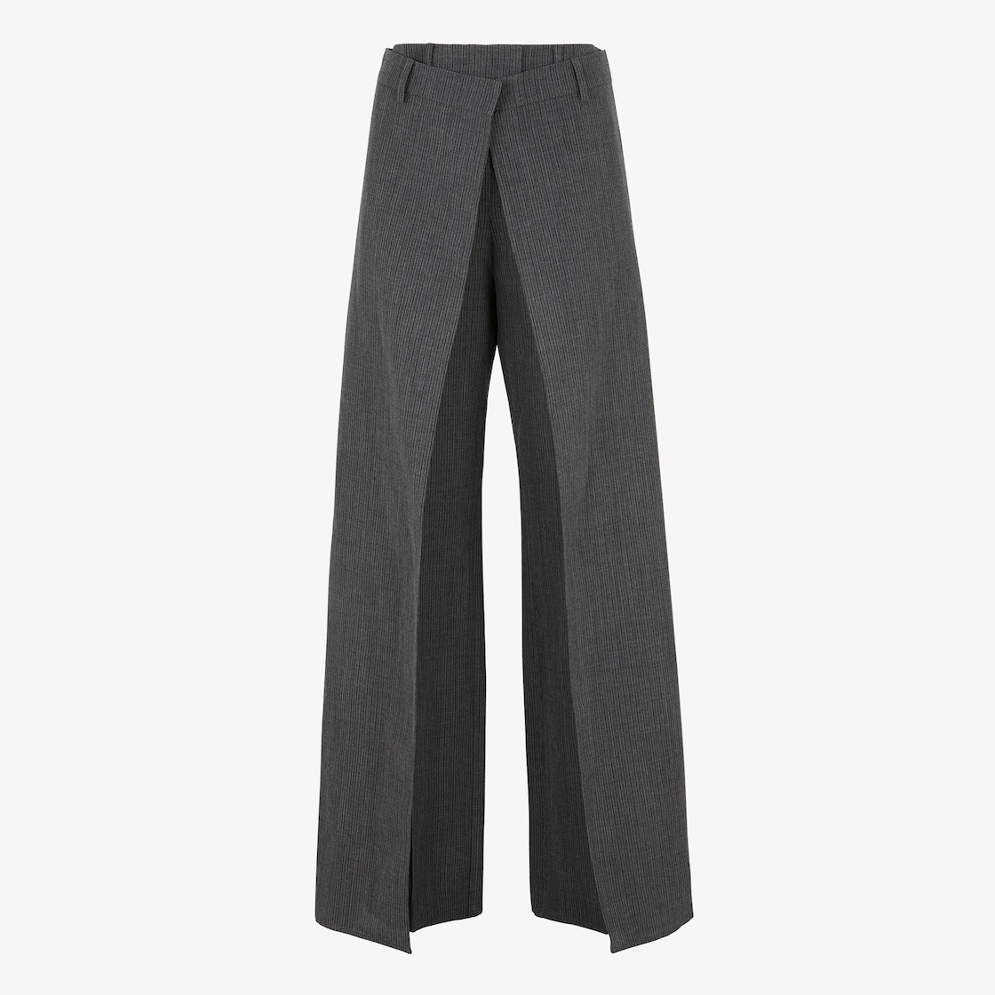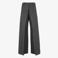 layered virgin wool trousers Spun from virgin wool, these Fendi trousers are distinguished by their side panels, designed to either be attached at the waist or to drape over the sides. Highlights - Grey - Virgin wool - Pinstripe pattern - Layered design - Belt loops - Concealed zip and hook fastening - Two side slit pockets - Two rear welt pockets Made in Italy Composition Lining: Cupro 100% Outer: Virgin Wool 100% SIZE & FIT Model measurements Height 5 ft 10 in(1.78 m) Bust/Chest 29.13 in(74 cm) Hips 35.43 in(90 cm) Waist 23.62 in(60 cm) FittingInformation Designed with a wide-leg cut, these trousers allow for a close fit at the waist and offer a loose and roomy fit over the leg Made from a midweight non-stretch fabric This piece fits true to size – take your usual size