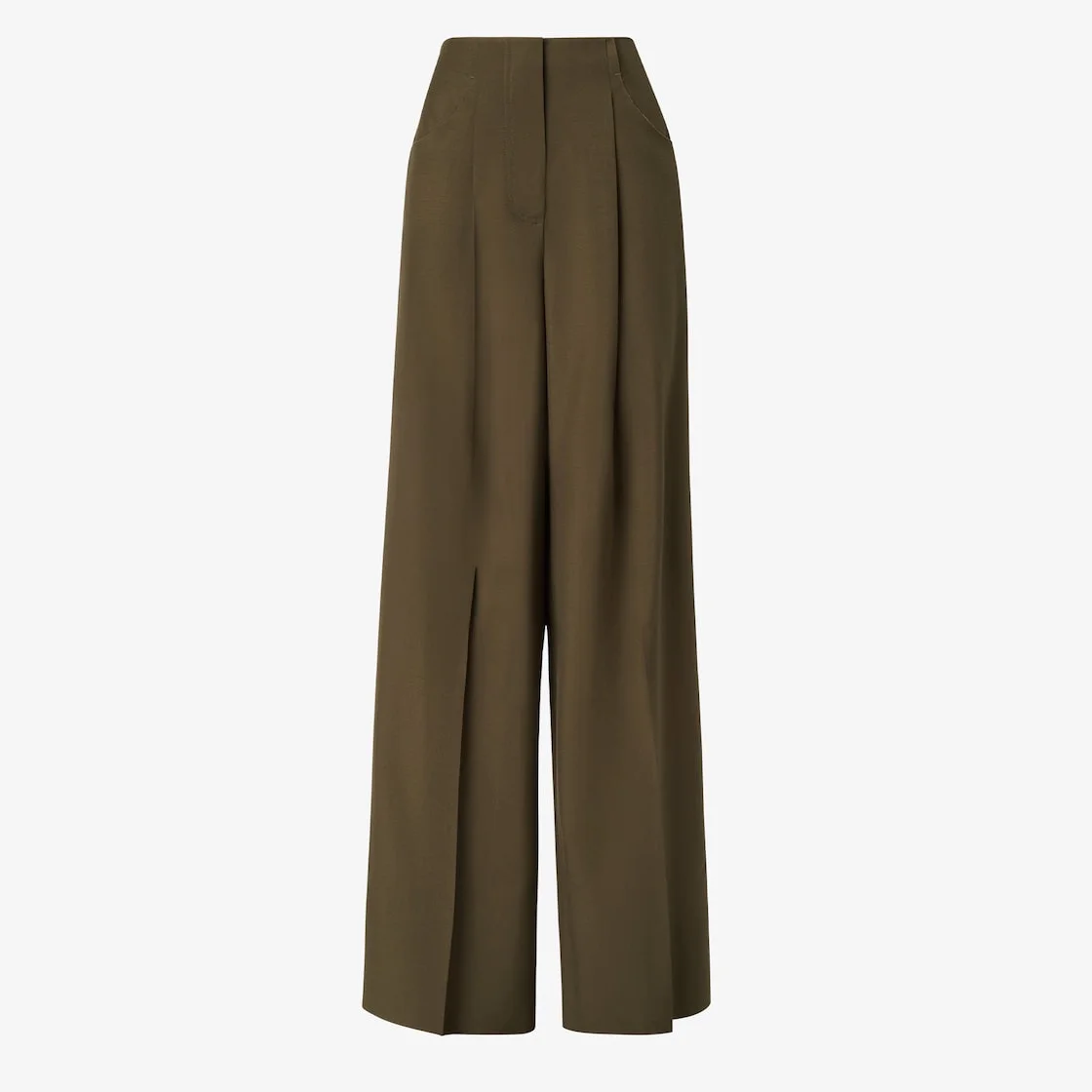 Wide leg pants. Hip pockets and pleats at the front waist. Front concealed zipper closure. Made of olive green wool and mohair. Made in Italy Composition: 75% wool, 25% mohair, fabric inner lining: 100% silk Size worn: 38 IT. The model is 180 cm tall Product Code: FR6655AQ3HF1T6G