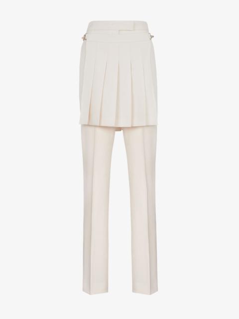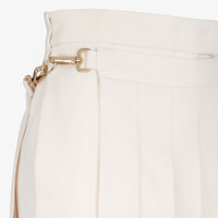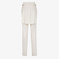 Cigarette pants with a trouser crease and pockets at the sides. Concealed zipper and hook closure. Made of creamy white Grain de Poudre wool. The matching panels with pleats to wear at the waist create an asymmetric effect with the pants. Gold-finish metalware. Made in Italy Composition: 100% fleece wool Size worn: 38 IT. The model is 179 cm tall Product Code: FR6504AJYFF1M2A
