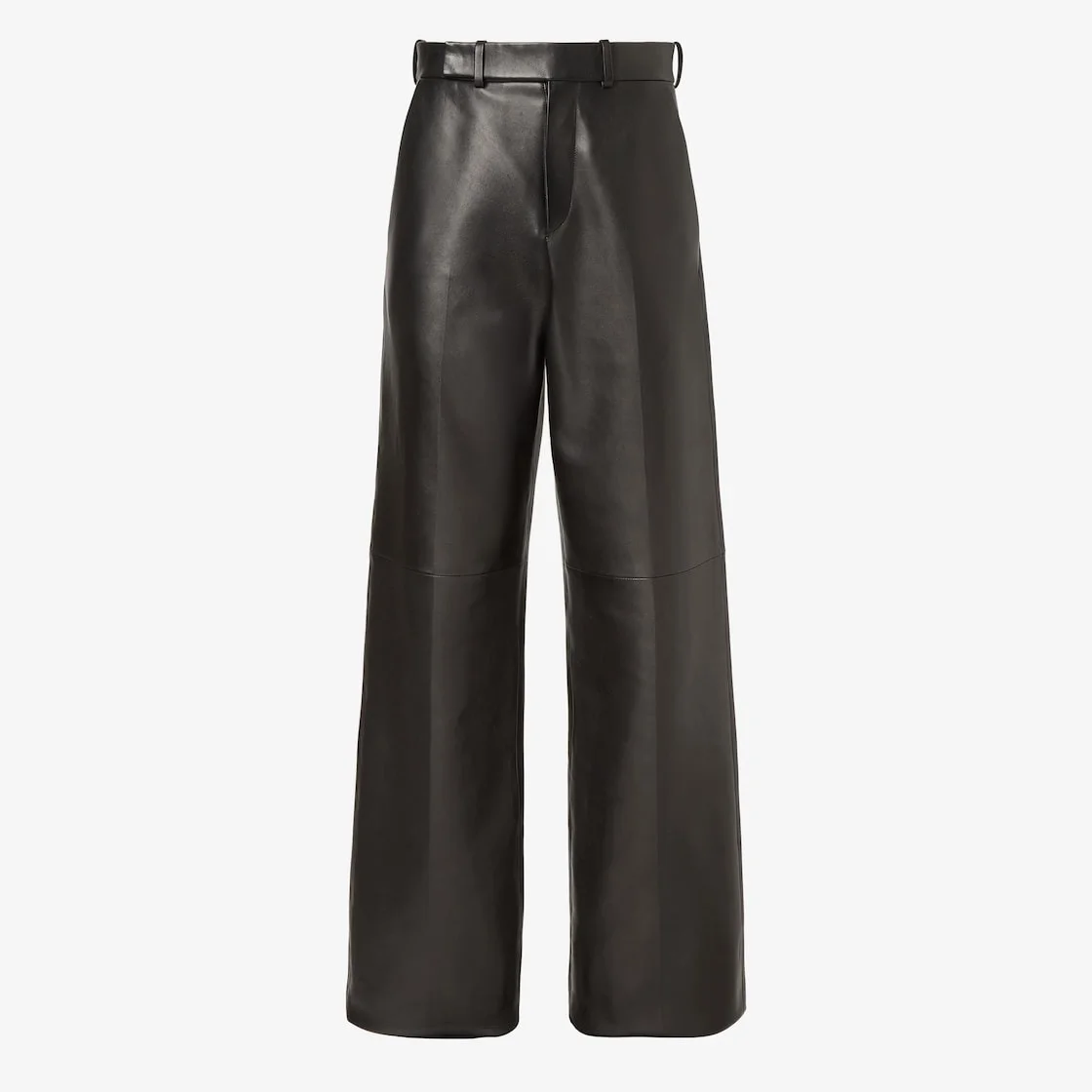High-waisted pants with a wide, straight leg. Side and back pockets. Belt loops at the waist. Concealed zipper closure. Made of soft, smooth black nappa leather. Finished with leather goods-style seaming and stitching. Made in Italy Composition: 100% lamb leather, lining: 100% viscose Size worn: 38 IT. The model is 178 cm tall Product Code: FPP833AUV3F0GME