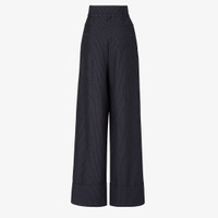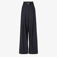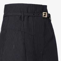 High-waisted pants with yoke detail and pleats on the front. Side pockets and wide, turned-up hem. Matching belt loops and belt with metal FF buckle at the waist. Concealed zipper fastening. Made of black wool with Fendi pinstripe motif. Palladium-finish metalware. Made in Italy Composition: 80% wool, 20% viscose, pockets: 100% silk Product Code: FR6673AW7IF0QG3