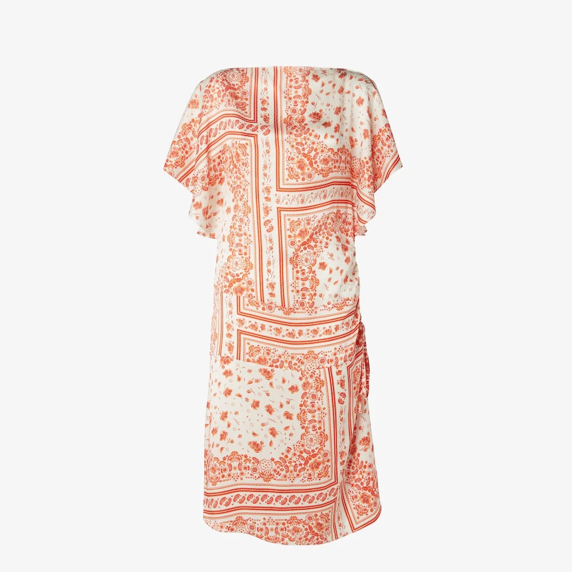 Midi dress with asymmetric silhouette, boat neckline and short sleeves. Featuring an adjustable drawstring on the left hip. Made of white viscose and silk with all-over Coral Bandana motif. Made in Italy Composition: 100% silk Size worn: 38 IT. The model is 180 cm tall Product Code: FDD373AVA1F0D4T