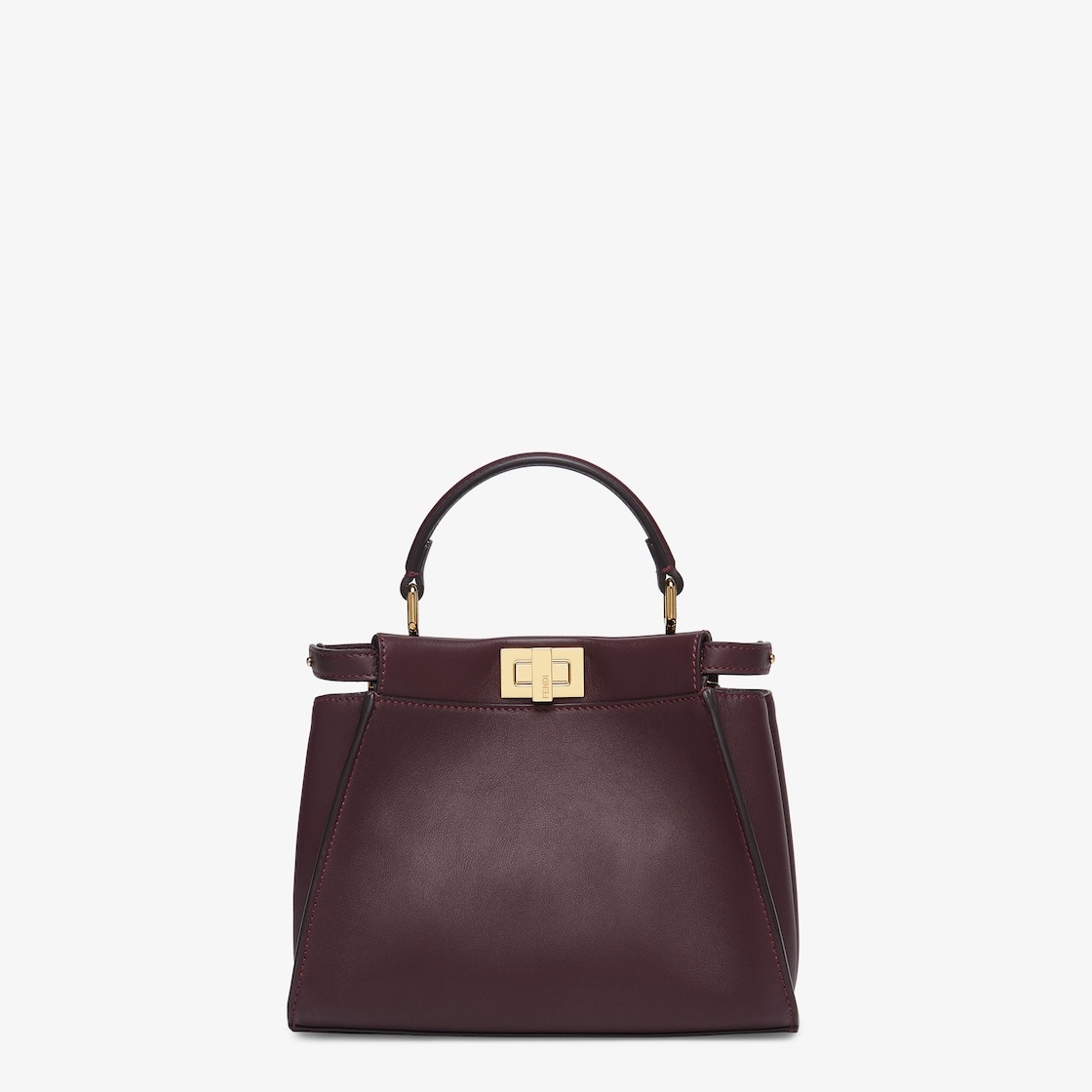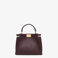 Iconic small Peekaboo bag, part of the collection designed by Stefano Pilati, made of burgundy leather and embellished with the classic twist lock on both sides. Features a fabric lining with a jacquard FF motif, a bar bound in leather, two interior compartments separated by a stiff partition, an inner zipper pocket and gold-finish metalware. The bag can be carried by hand or worn either on the shoulder or cross-body thanks to the handle and adjustable, detachable shoulder strap. Made in Italy Composition: 100% calf leather, inside: 27% polyester, 27% polyamide, 27% polyurethane, 15% cotton, 4% resin Model height: null Size worn: null Measurements: - Height : 18 cm - Depth : 11 cm - Width : 23 cm - Weight : 0.96 kg Product Code: 8BN244AQ09F1MZH