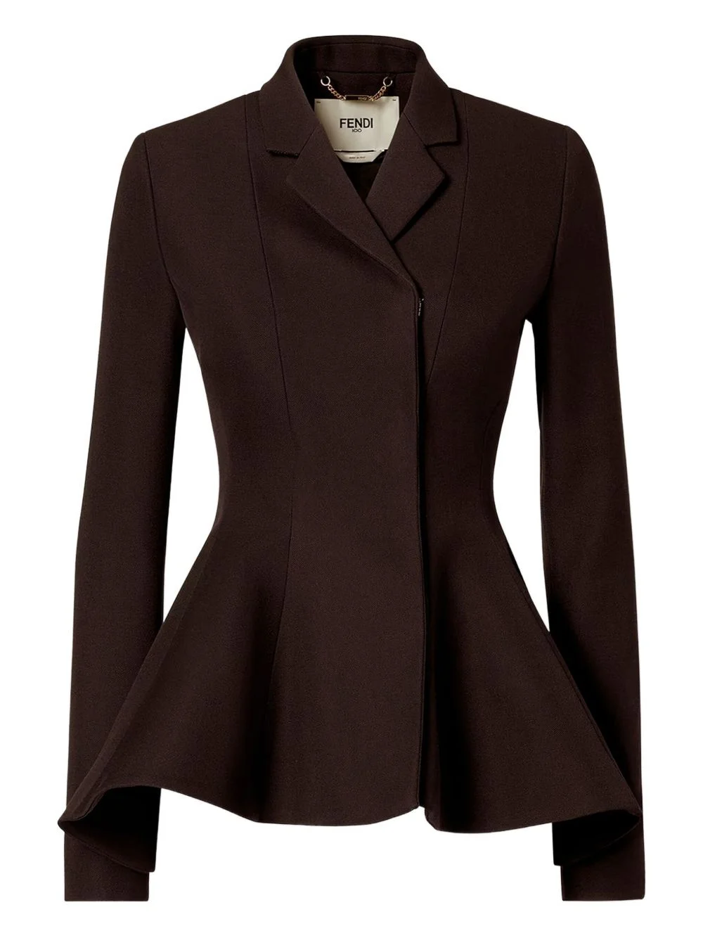peplum blazer Highlights - Dark brown - Lapel collar - Long sleeves - Peplum hem - Concealed fastening Made in Italy Composition Outer: Wool 100%, Cattle Horn 100% Lining: Cupro 100% Washing instructions Read Manufacturer Guidelines