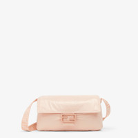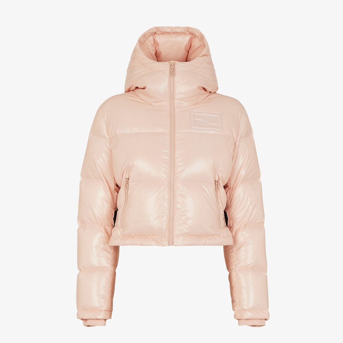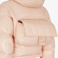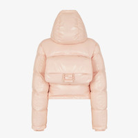 Cropped down jacket with hood and velcro side straps. Padded and quilted, it is embellished with side zipper pockets and stretch cuffs. Zipper closure. Made of ultra-lightweight pink lacquered nylon. Decorated with embossed Fendi Baguette patch on the chest. The item can be folded away into the iconic Baguette bag seen on the back. Made in Italy Composition: : 100% Polyamide, lining: 100% Polyamide80, 20% Duck padding (feather) Model height: null Size worn: null Product Code: FAN106AK8NF1J7A