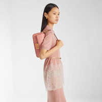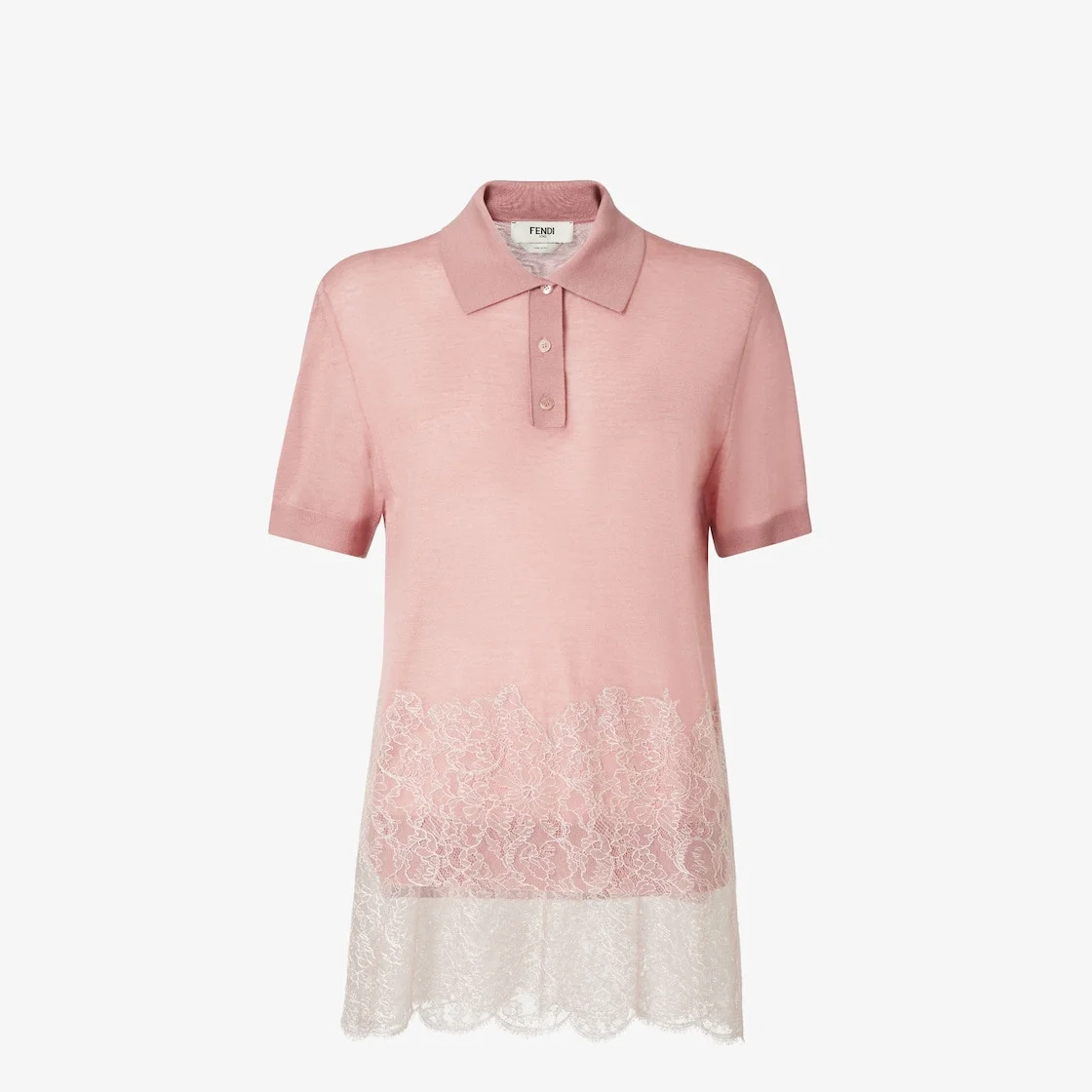 Short-sleeved polo shirt. This style has a classic collar closed with flat buttons. Made of lightweight pink cashmere and silk knit. Inspired by an archive design from 1968 and finished with a tone-on-tone lingerie-effect lace and tulle inserts. Made in Italy Composition: 70% cashmere, 30% silk, 4 buttons: mother of pearl Size worn: 38 IT. The model is 180 cm tall Product Code: FZXE00AUZSF1T6N