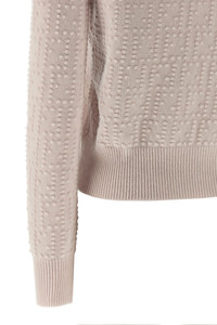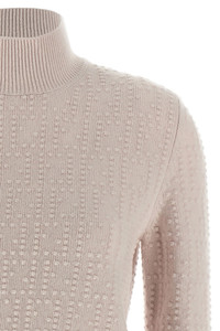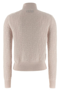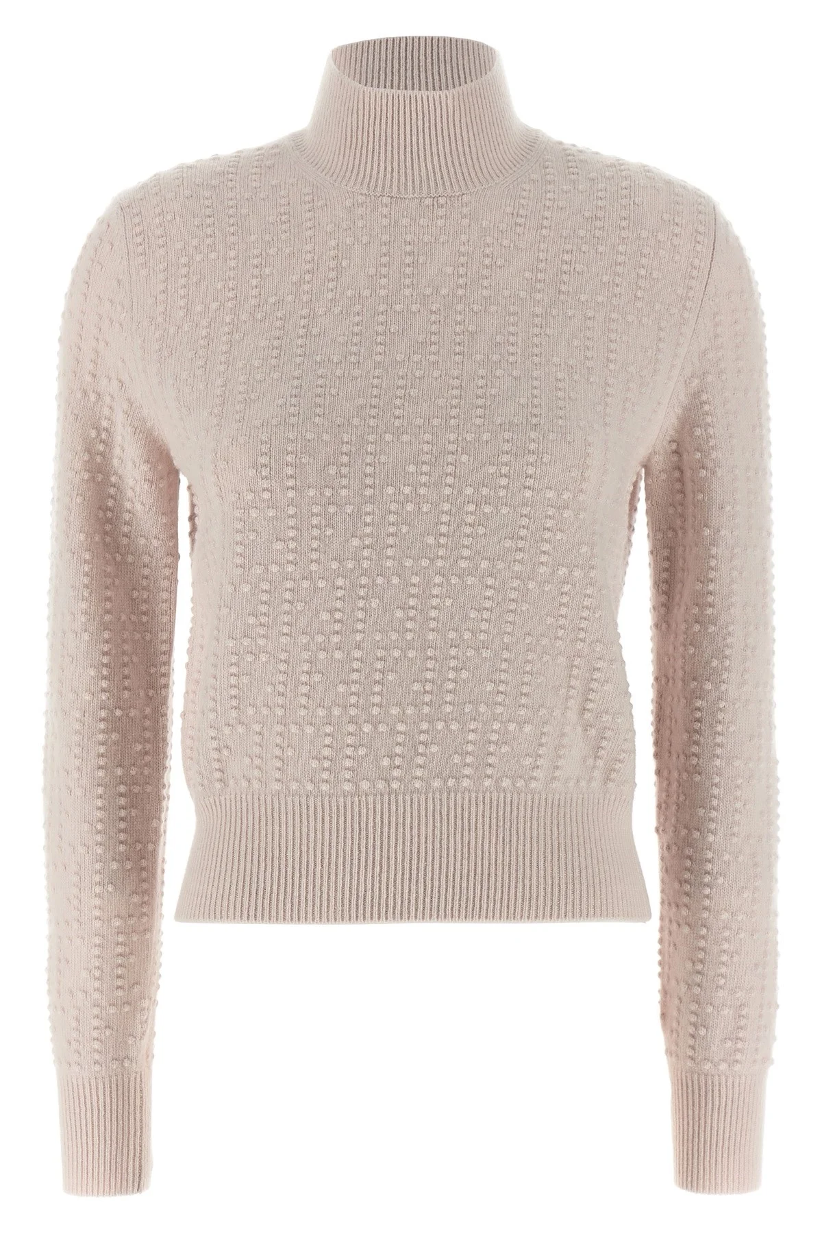 cod. FZXE09AYM0F16A8 'Pon Pon' wool and cashmere blend sweater, high neck, all-over 'FF' workmanship, long cuffed sleeves. Color: Pink Size & Fit: True to size fit Composition: 70% wool 30% cachemire Made in: Italy