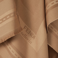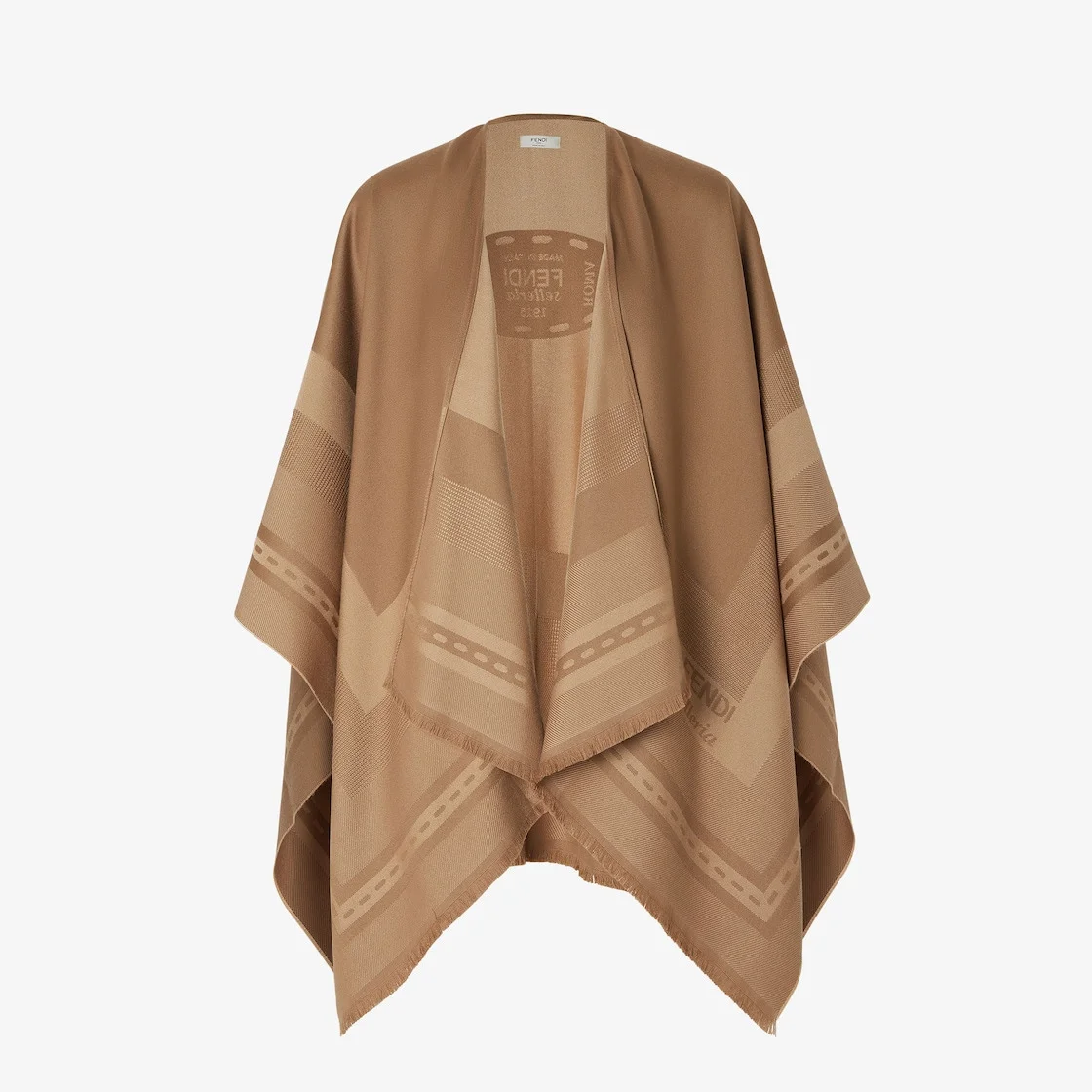 Lightweight, wraparound poncho made of a luxurious wool and cashmere blend in a caramel color. The jacquard creates playful three-dimensional textures, capturing details reminiscent of the iconic Selleria technique, and is embellished with stitching details along all edges. Fendi Selleria logo at the hem. Made in Italy Composition: material 1: 66% fleece wool, 34% cashmere Product Code: FXX775AUM2F0QB8