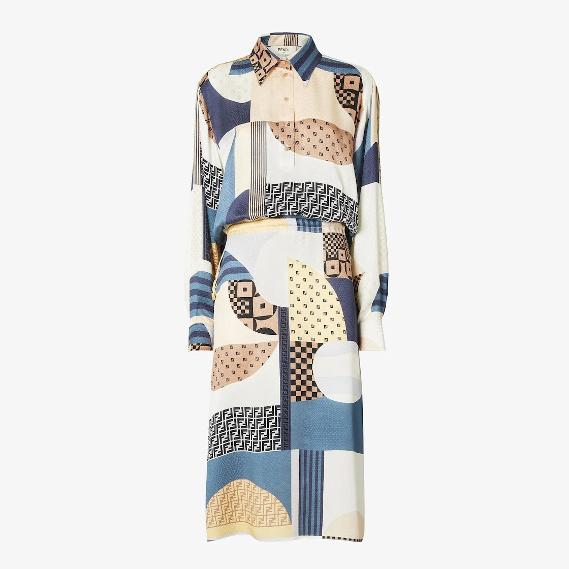 Midi shirt dress with low-set long sleeves and wide cuffs. Fluid silhouette with adjustable drawstring waist. Polo-style collar fastened with 5 small mother of pearl buttons. Made of silk jacquard crepe with a blue patchwork print that depicts a combination of logos and archive patterns. Made in Italy Composition: 100% silk, 8 buttons: mother of pearl Product Code: FDD374AUQMF1SAT