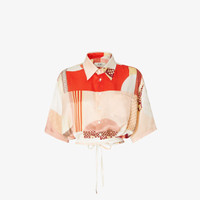 Short-sleeved cropped shirt. Featuring a drawstring hem with long laces to tie at the waist. Breast pocket and button closure. Made of silk jacquard crepe with a pink patchwork print that depicts a combination of logos and archive patterns. Made in Italy Composition: 100% silk Size worn: 38 IT. The model is 179 cm tall Product Code: FS8278AUQMF1SAW