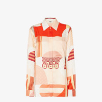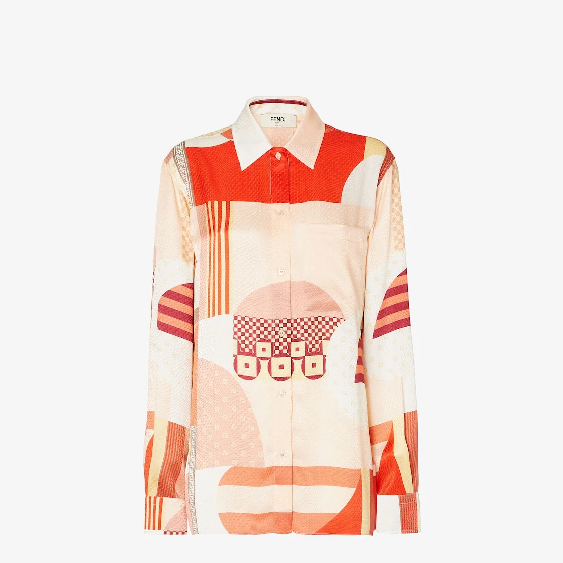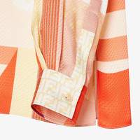 Regular-fit short-sleeved shirt with shirt collar and cuffs. Mother of pearl button front closure. Made of silk jacquard crepe with a pink patchwork print that depicts a combination of logos and archive patterns. Made in Italy Composition: 100% silk, 11 buttons: mother-of-pearl Size worn: 38 IT. The model is 179 cm tall Product Code: FS8274AUQMF1SAW