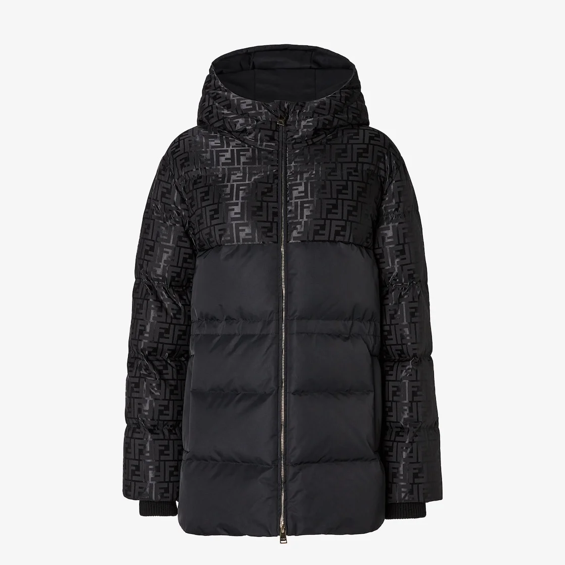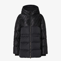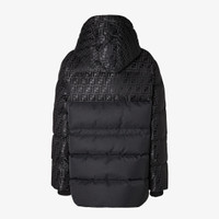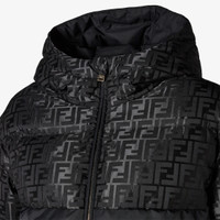 Parka with high collar and drawstring hood. Diagonal pockets and knitted cuffs. Front zipper closure. Made in a shiny jacquard nylon with iconic black FF motif. Made in Italy Composition: 64% cotton, 36% polyamide, 100% polyamide, coating: 100% polyurethanic resin, trim: 100% wool, lining: 100% polyester, 90% duck down, 10% duck feathers Product Code: FAN231AT91F0GME