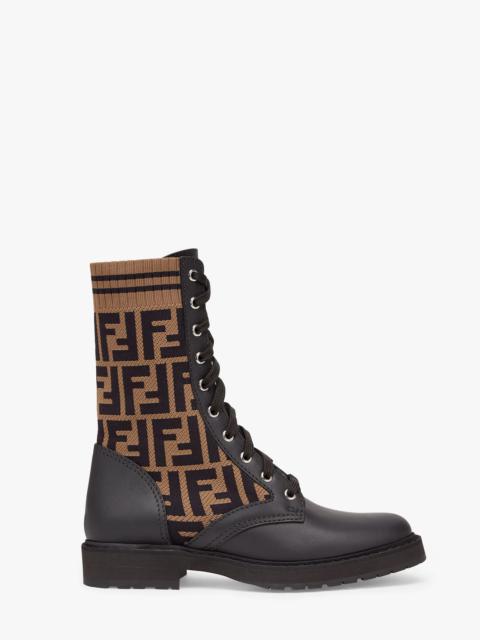 Rockoko combat boots with stretch fabric inserts. Non-slip rubber sole. Made of black calfskin. The sock-like high top is trimmed with the FF motif and contrasting sporty stripes. Made in Italy Measurements: - Heel height : 30 mm Composition: 100% calf leather, 87% polyamide, 13% elastane, inside: 100% calf leather Product Code: 8T6780A3H4F13MC