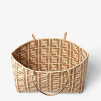 Large shopper bag, created in 1997 together with the Baguette and designed to partner it. A functional, timeless carry-all, it is the perfect combination of practicality and refined details. Made with woven raffia, a natural-fibre sourced in Madagascar, which is crocheted to create an intricate series of knots that depict the iconic Fendi FF motif. Unlined. It can be carried by hand or on the shoulder thanks to the beige calfskin handles finished with hand-stitched macro topstitching, an emblem of the iconic Selleria workmanship handed down through generations of Fendi artisans since 1925. Made in Madagascar Composition: 100% raffia, 100% calf leather Product Code: 8BH425AS3BF17A1