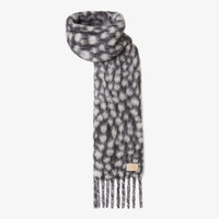 Long scarf with fringe motif at the hem. Made of soft alpaca and wool yarn with the collection’s Falena Dots motif all over in black and white. Finished with a beige leather patch on the front and embossed Fendi logo. Made in Italy Composition: 70% alpaca, 18% polyamide, 12% fleece wool Product Code: FXT144AWEIF0ZE7