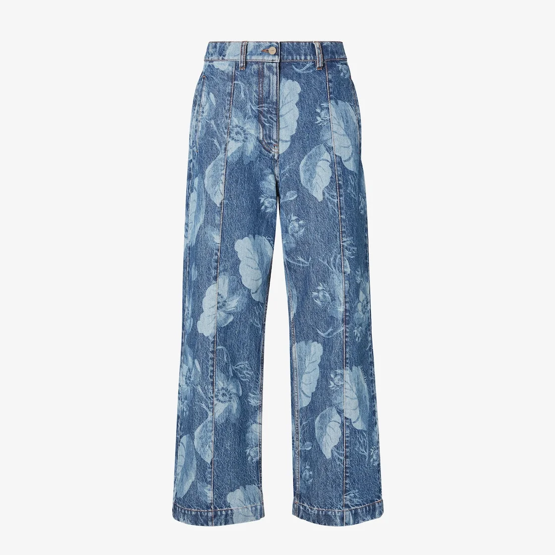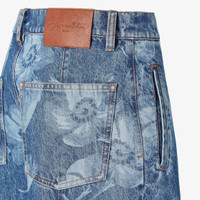 Long, regular-fit straight pants with sewn-in crease on the leg. Side welt pockets and pockets on the back. Concealed zipper and logo tack button closure. Made of dark blue cotton denim, with an all-over Sea Garden motif print in a slightly contrasting color. Embellished with tobacco-colored stitching and leather strap on the back with logo. Made in Italy Composition: 100% cotton Size worn: 38 IT. The model is 179 cm tall Product Code: FLP868ASMDF1SAT