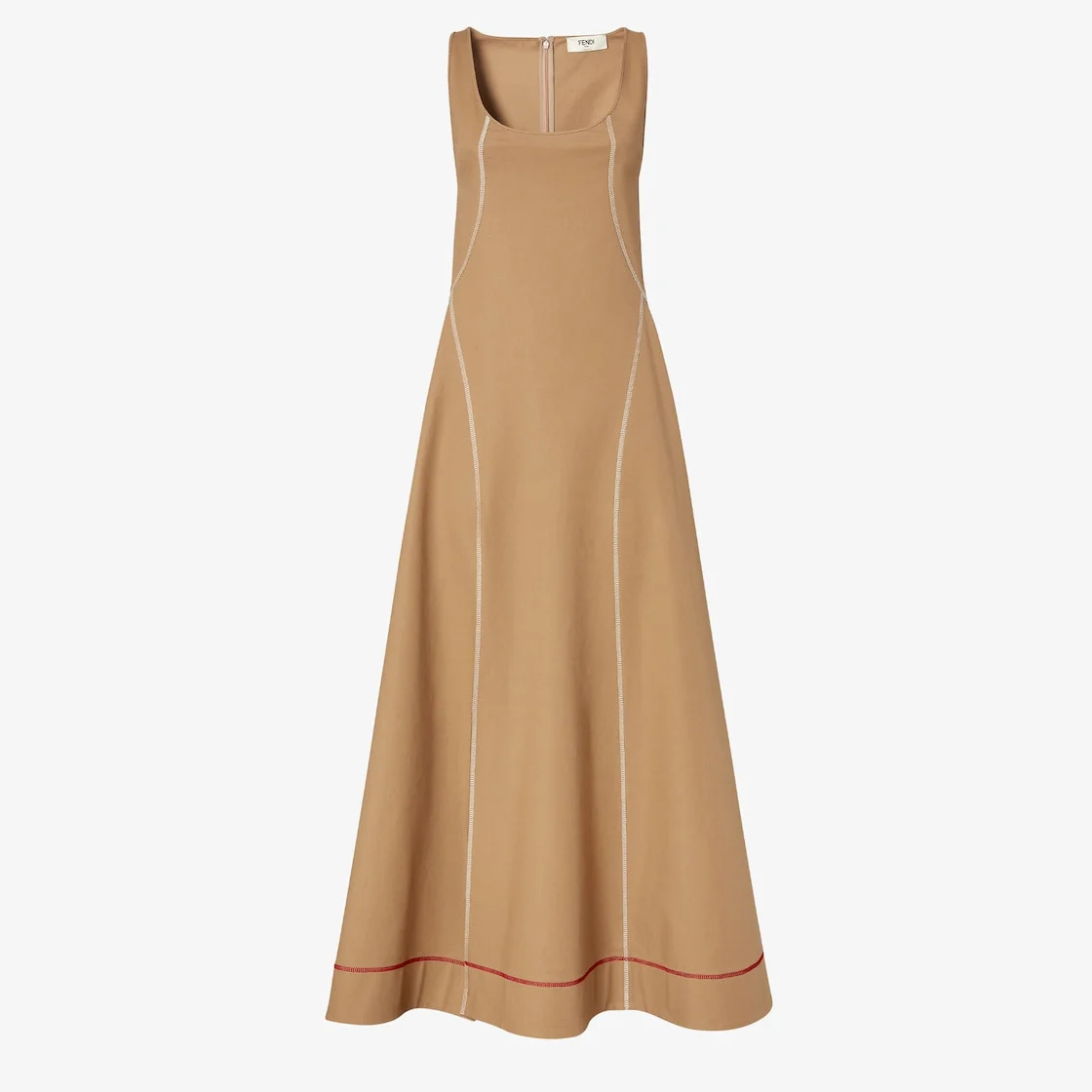 Sleeveless flared long dress. Deep asymmetric slit on the front. Made of dark beige stretch compact cotton. Embellished with white and red contrasting stitching for an inside-out effect. Logo embroidery on the left-hand side. Made in Italy Composition: 98% cotton, 2% elastane Size worn: 38 IT. The model is 180 cm tall Product Code: FDD365AUJRF1SB0