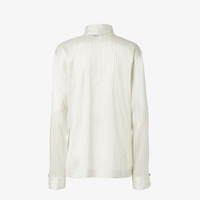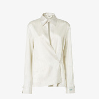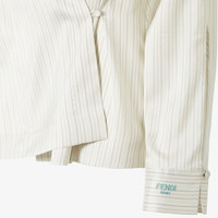 Long-sleeved shirt with a crossover silhouette. Shirt collar and wide buttoned cuff. The asymmetrical closure with a small side button creates a draped motif on the side and a cut-out detail on the neckline. Made of white silk with a sage green fine-striped pattern. Embroidered Fendi Roma logo on the left hand-side cuff. Made in Italy Composition: 100% silk Size worn: 38 IT. The model is 180 cm tall Product Code: FS8287AYNPF1T6E