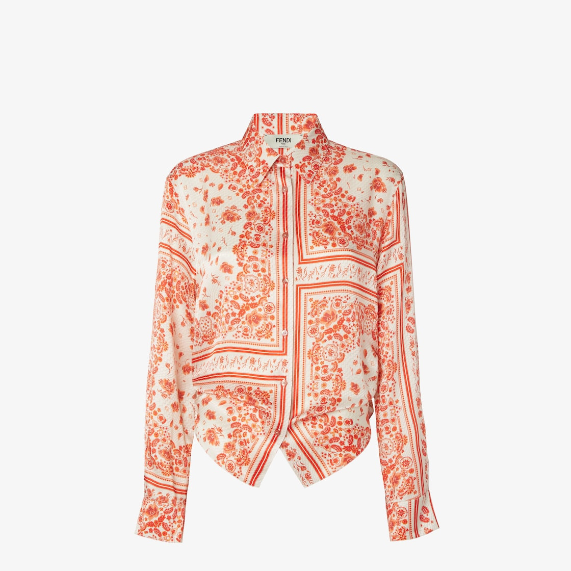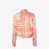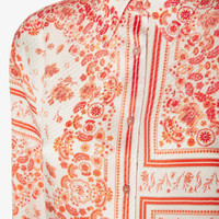 Long sleeve shirt with drawstring adjustable at the sides. Flowing style with dropped shoulders and rounded hemline. Mother of pearl button closure. Made of white silk jacquard crepe with pink Coral Bandana print. Made in Italy Composition: 100% silk, 12 buttons: mother of pearl Product Code: FS8272AVA1F0D4T