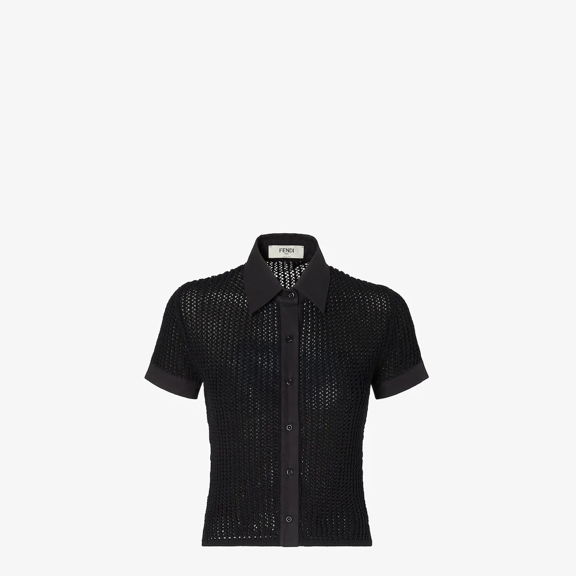 Short-sleeved, slim-fit, military-inspired shirt. Button closure. Made of black cotton yarn in a chunky mesh knit. Matching color cotton poplin collar, cuffs and front closure. Tonal Fendi logo embroidered on the left sleeve. Made in Italy Composition: 100% cotton, 7 buttons: mother-of-pearl Product Code: FZE572AW4NF0GME