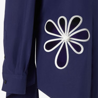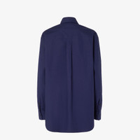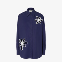 Long-sleeved shirt with rounded side slits. Center-back pleat and cuffs with buttons. Concealed button closure. Made of dark blue pure cotton poplin with Fendi Ajour motif embellished with contrasting white edges. The cut-out details and play of textures create a three-dimensional effect with a strong visual impact. Fendi logo embroidered at the hem of the left wrist. Made in Italy Composition: 100% cotton, 54% polyester, 46% cotton, lining: 100% polyamide, 12 buttons: mother of pearl Product Code: FS8355AW7VF1W0A