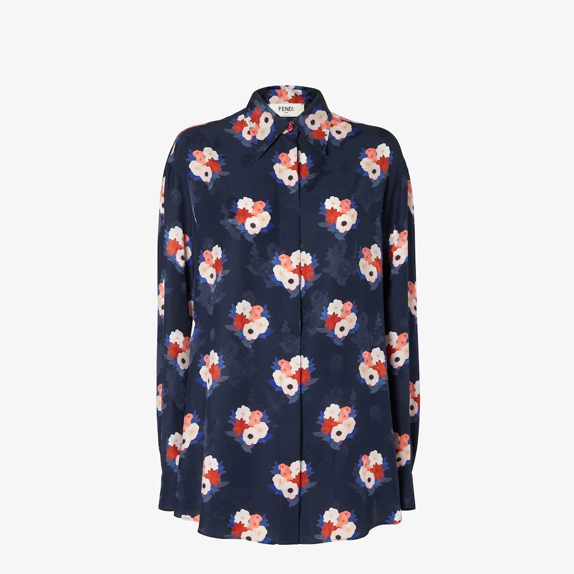 Flowing long-sleeved shirt. Central pleat on the back and buttoned cuffs. Concealed button closure. Made of dark blue silk FF jacquard. Embellished with the collection’s Fendi Bouquet motif printed all over in red, pink and blue. Made in Italy Composition: 100% silk, 13 buttons: mother of pearl Product Code: FS8357AW9HF1W0A