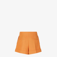 Flared shorts with double pleat on the front. Side pockets and turned-up hem. Concealed zipper and hook closure. Made of orange Grain de Poudre wool. Embellished with Fendi lettering in matching-tone embroidery on the left-hand side. Made in Italy Composition: 100% fleece wool Product Code: FR6690AJYFF1UKE