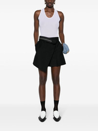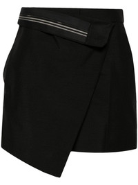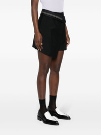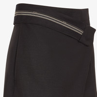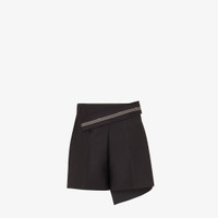 High-waisted shorts. Trouser crease and side inset pockets. Concealed zipper and hook closure. Made of black kid mohair. Tailored construction with wrap-effect asymmetric panel and inside-out detail at the waist with Fendi Roma logo ribbon. Made in Italy Composition: 60% mohair, 40% wool, lining: 100% silk Size worn: 38 IT. The model is 177 cm tall Product Code: FR6543S9AF0GME