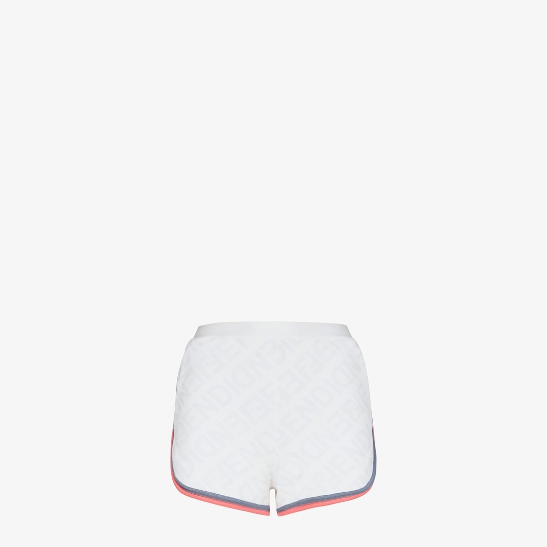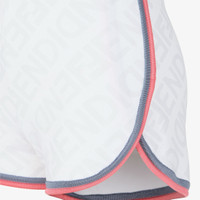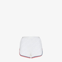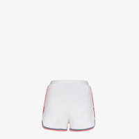 Shorts with an elasticated waist and side slits. Made of a white viscose knit, with all-over Fendi Mirror lettering intarsia in the same color. Embellished with a double sporty stripe on the background in pink and light blue. Made in Italy Composition: 53%viscose, 40%polyamide, 3%polypropylene, 4%polyurethane Model height: 177 cm Size worn: 38 IT Product Code: FZR797ANZEF0ZNM