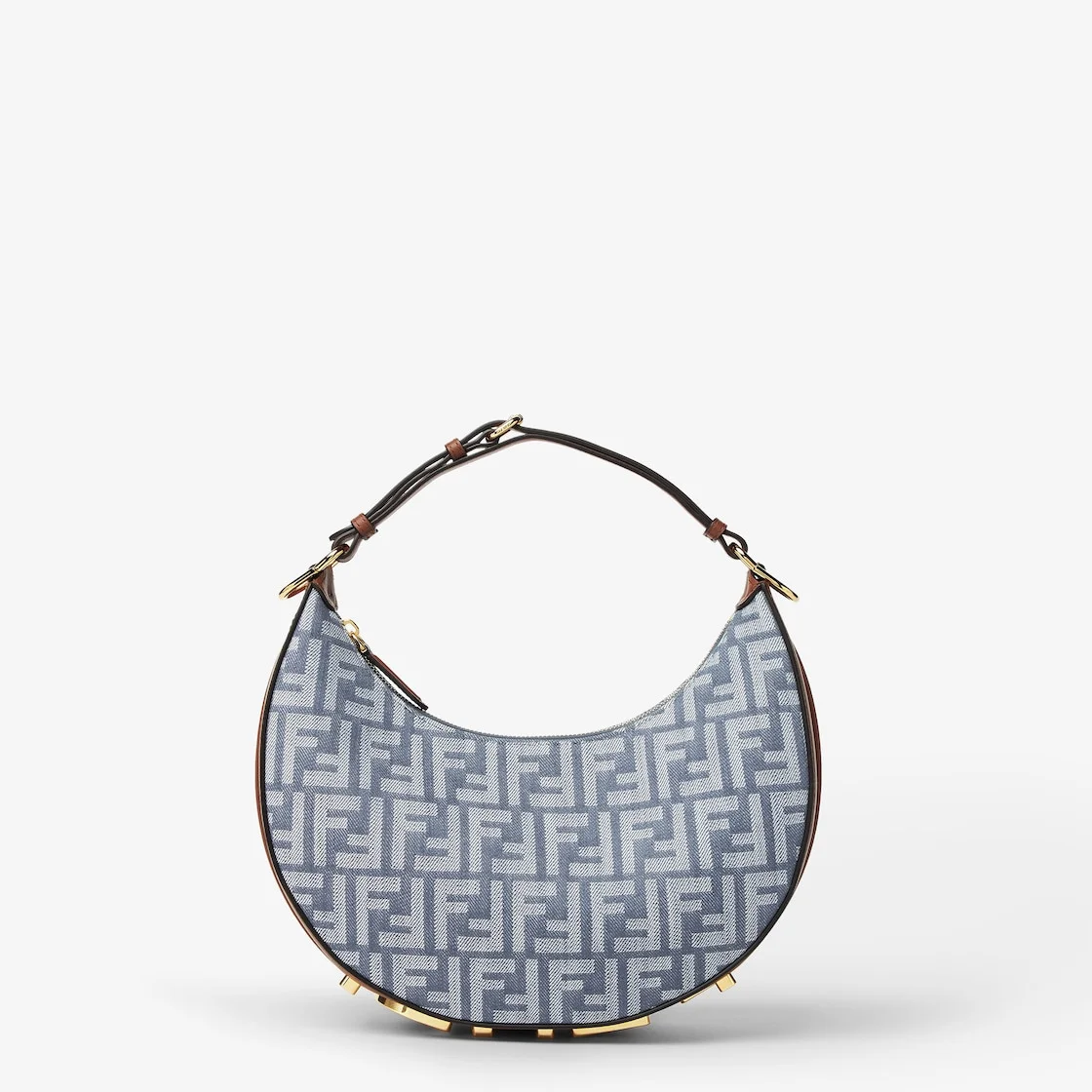 Small Fendigraphy hobo bag with a contemporary look and bold details. Made of denim-effect FF jacquard in shades of blue, decorated with vintage gold-finish metal FENDI lettering on the base, visible when wearing the bag under the arm. Zipper closure with a lined internal compartment, gold-finish metalware. It can be worn on the shoulder thanks to the adjustable, detachable handle in blue leather. Comes with hooks that allow a shoulder strap to be attached for wearing cross-body. Made in Italy Composition: 34% cotton, 27% polyamide, 21% polyurethane, 18% polyester, 100% calf leather, inside: 63% cotton, 34% polyester, 3% acrylic Product Code: 8BR798AUT4F1SYG