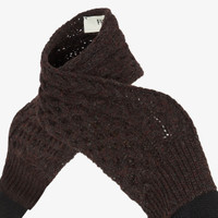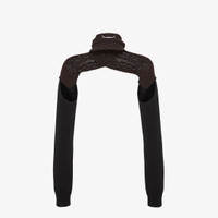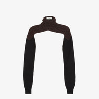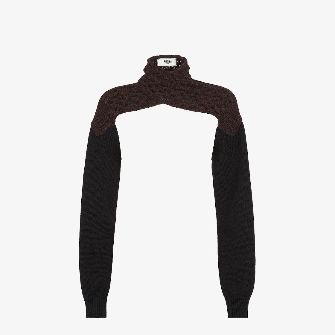 Shrug with high collar wrapped over on the front and long sleeves. Made of dark purple wool knitted in Aran stitch. The contrasting black jersey sleeves create a trompe l’oeil effect. Ribbed cuffs. Small chain with Fendi Roma tag in palladium-finish metal at the back of the neck. Made in Italy Composition: 100% cashmere Product Code: FZXC53ASJNF0P1B