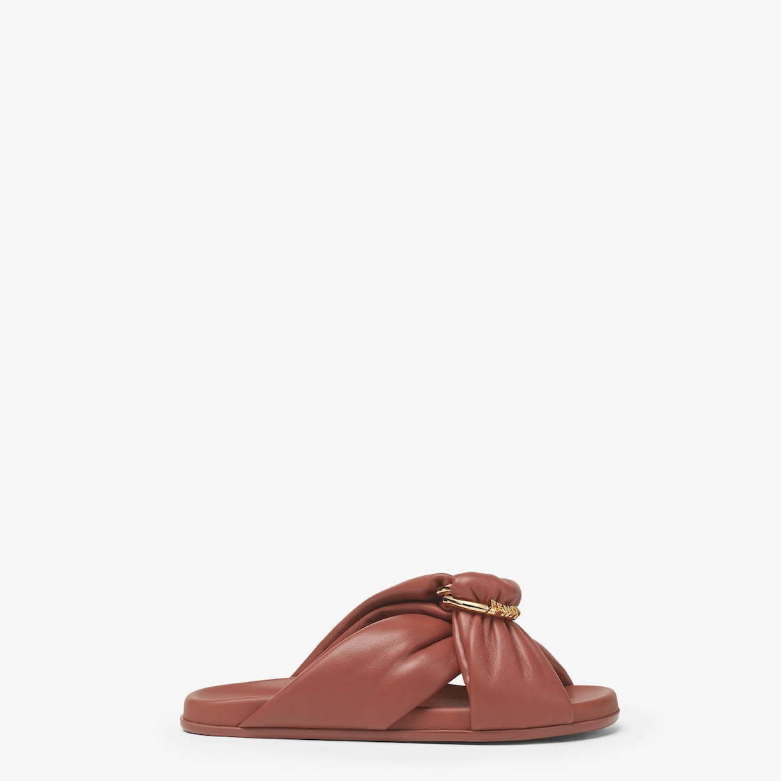 Padded double-band flat slides with decorative D-ring buckle with three-dimensional Fendi lettering. Made of sienna nappa leather. Gold-finish metalware. Made in Italy Composition: 100% lamb leather, inside: 100% lamb leather Product Code: 8X8645NBAF1G1U