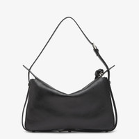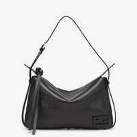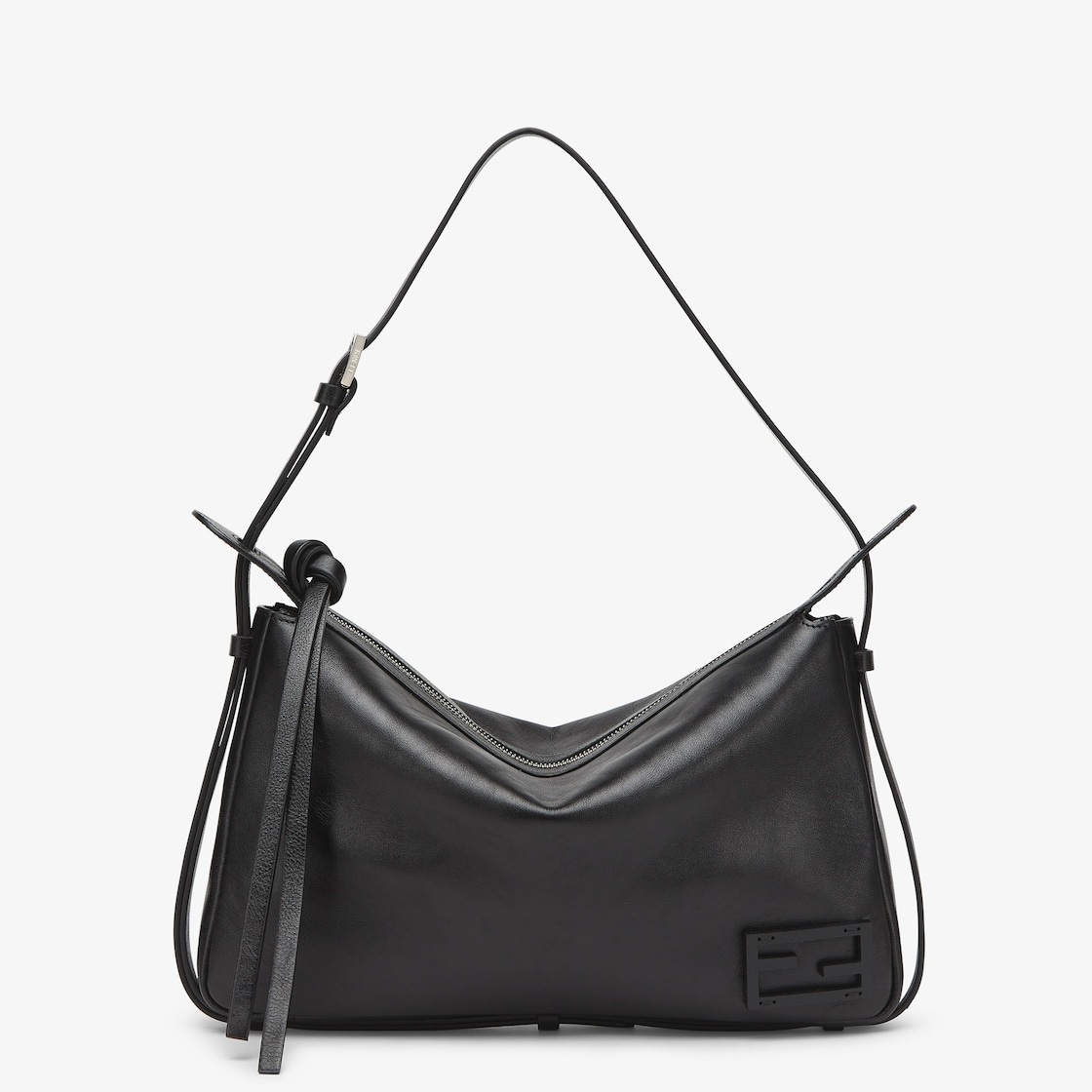Medium Simply Fendi bag, a soft shoulder bag presented at the Fall-Winter 2024/25 fashion show, named after its elegant and essential design inspired by a 1990s archive style. Made of black low-sheen finish calfskin. Decorated with the iconic FF embellishment in tone-on-tone patent leather. Closed by a long calfskin zipper-pull with knot and featuring an internal lined compartment with a zipper pocket and palladium-finish metalware. Can be worn on the shoulder or cross-body thanks to the adjustable shoulder strap. Made in Italy Composition: 100% calf leather, interior: 100% calf leather Product Code: 8BR829AS7AF1QD0