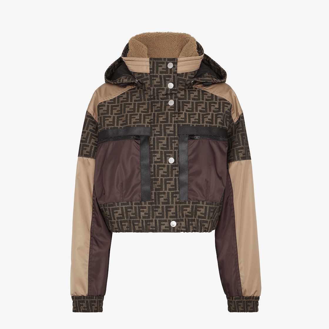 High-neck ski jacket cropped to the waist. Two zipper pockets on the chest. Stretch cuffs and hem. Zipper and snap closure. Made of jacquard canvas with the iconic FF motif in brown. Finished with color block inserts in beige technical fabric, inside collar in sheepskin and pockets edged in black ribbon. Made in Italy Composition: 65% polyester, 35% cotton, 80% polyamide, 20% elastane, coating: 100% polyurethanic resin, lining: 100% polyester Product Code: FAN170AQCBF13IZ